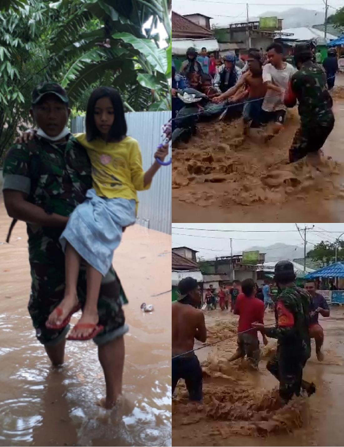 | Potret TNI Jajaran Kodim 1608 Bima Bantu Evakuasi Korban Banjir di Kota Bima. |